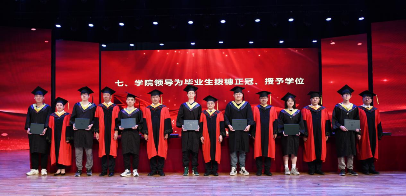 在学位授予环节,学院领导、各系负责人为全体毕业生逐一拨穗正冠,颁发学位证书并合影留念。