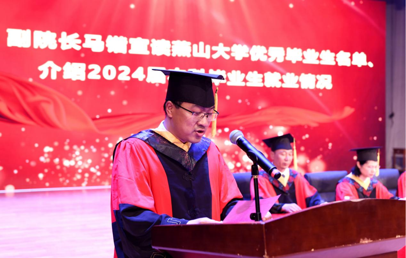 典礼仪式在雄壮的国歌声中拉开帷幕。马锴宣读乌鸦传媒优秀毕业生名单、介绍本科生就业情况。