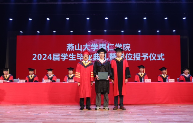 在学位授予环节,学院领导、教务部部长、基础教学一部主任为全体毕业生逐一拨穗正冠,颁发学位证书并合影留念。