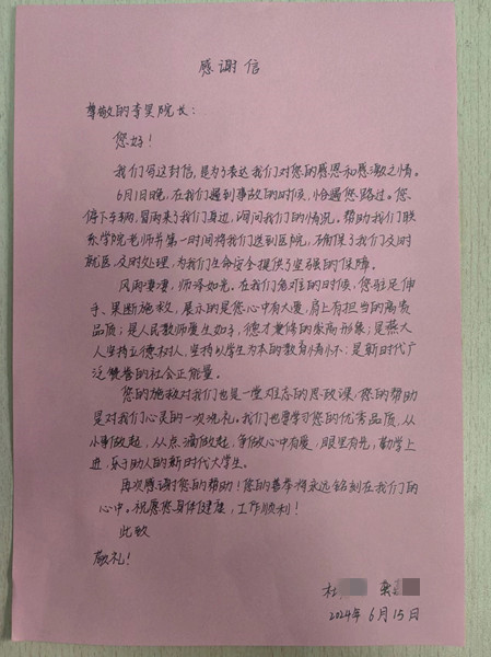 杜某、龚某两位同学在写给李昊的感谢信中说道:“风雨凄凄,师泽如光,在我们危难的时候,您驻足伸手、果断施救,展示的是您心中有大爱,肩上有担当的高贵品质;是人民教师爱生如子、德才兼修的崇高形象;是燕大人坚持立德树人、以学生为本的教育情怀;是新时代广泛赞誉的社会正能量。我们要学习您的优秀品质,从小事做起,从点滴做起,争做心中有爱,眼里有光,勤学上进,乐于助人的新时代大学生。”