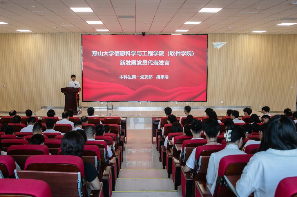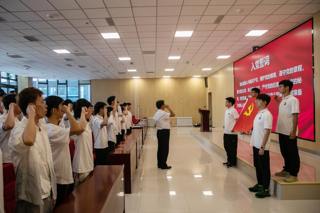 会上学院为2024年新发展的党员代表举行入党宣誓仪式。宣誓仪式中,学院“光荣在党25年”党员代表为新党员发放了《中国共产党章程》并佩戴党员徽章。学院副处级辅导员刘学才带领新发展的党员代表面向党旗,庄严宣誓。本科生第一党支部胡宗浩代表新党员发言。