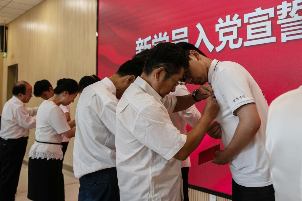 学院“光荣在党25年”党员代表为新党员发放了《中国共产党章程》并佩戴党员徽章