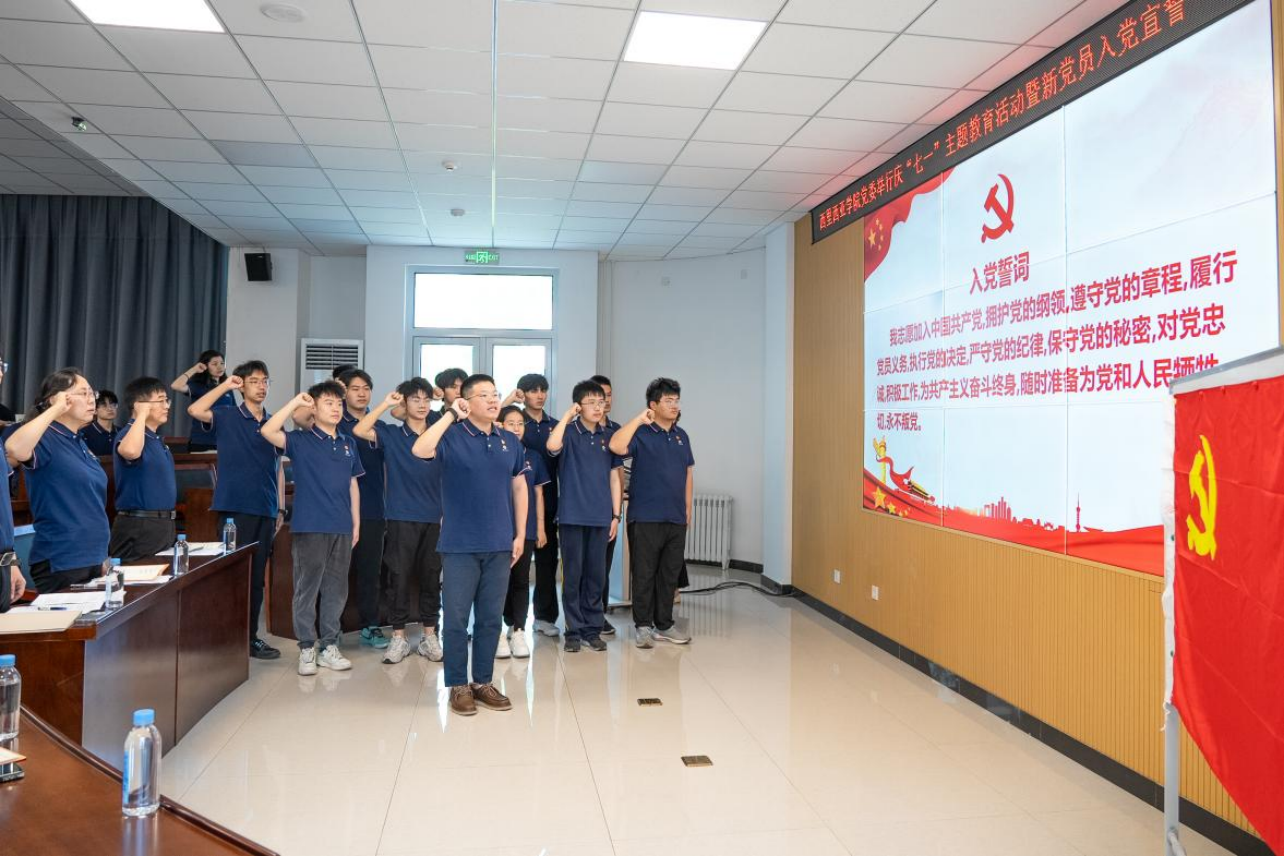 随后,由学生党支部书记燕博担任领誓人,与会党员全体起立,面向党旗,新发展党员宣读入党誓词,全体老党员重温入党誓词。铿锵有力的誓言久久回荡,彰显出每一名党员掷地有声的承诺,饱含着对党的无限忠诚和热爱。