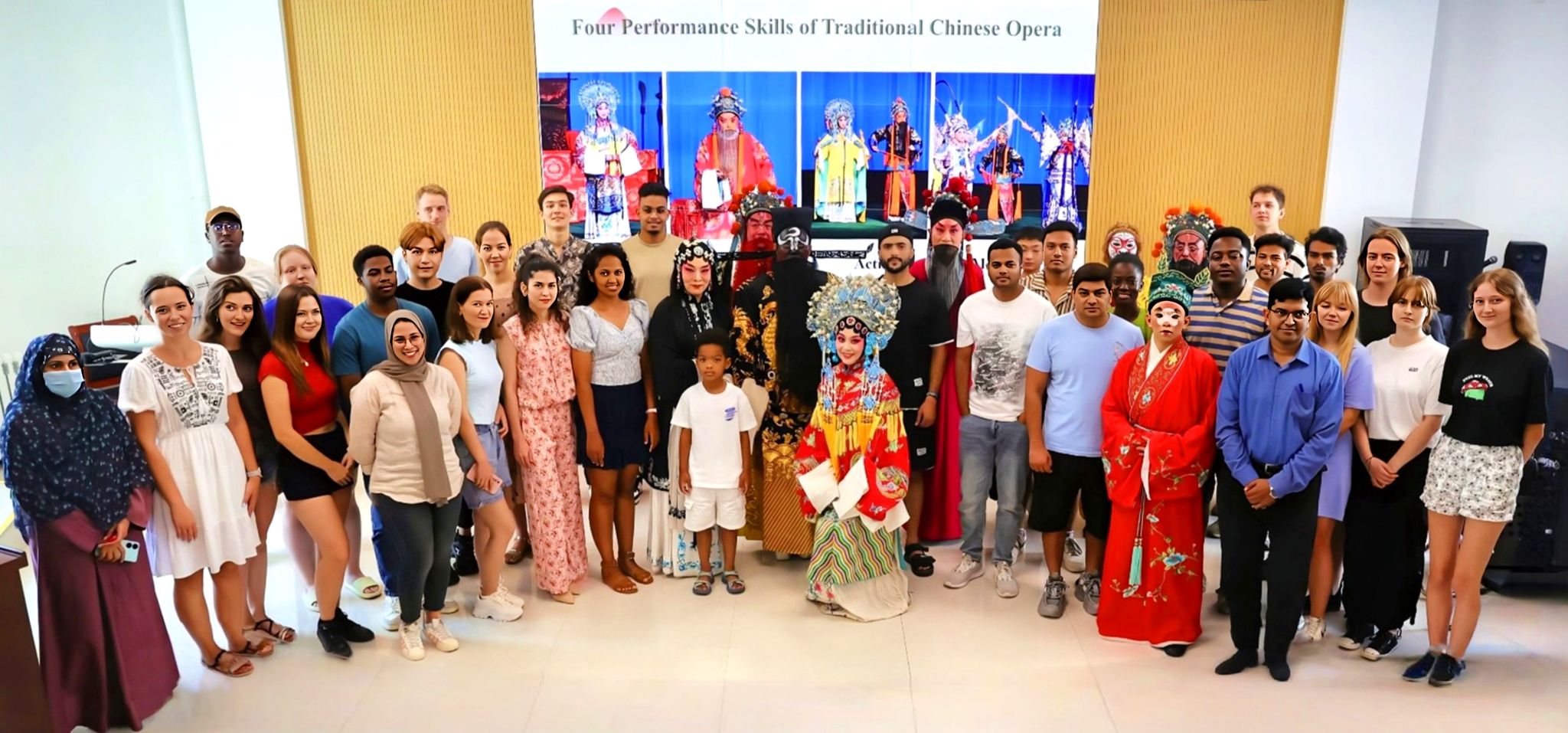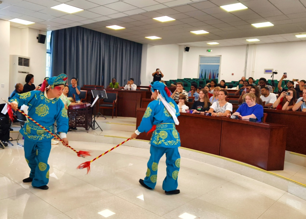 活动过程中,秦皇岛市小海燕评剧团向全体在场留学生作报告并开展互动交流。国家二级导演、小海燕评剧团编创室主任刘建平讲解了戏曲表演的基本知识和评剧艺术的表演技巧,剧团演员展示了戏曲的不同行当,演绎了传统评剧《秦香莲》选段——“大堂”。互动环节中,留学生也穿上戏服,跟着老师扮装、学唱。现场气氛热烈,掌声连连,喝彩不断。