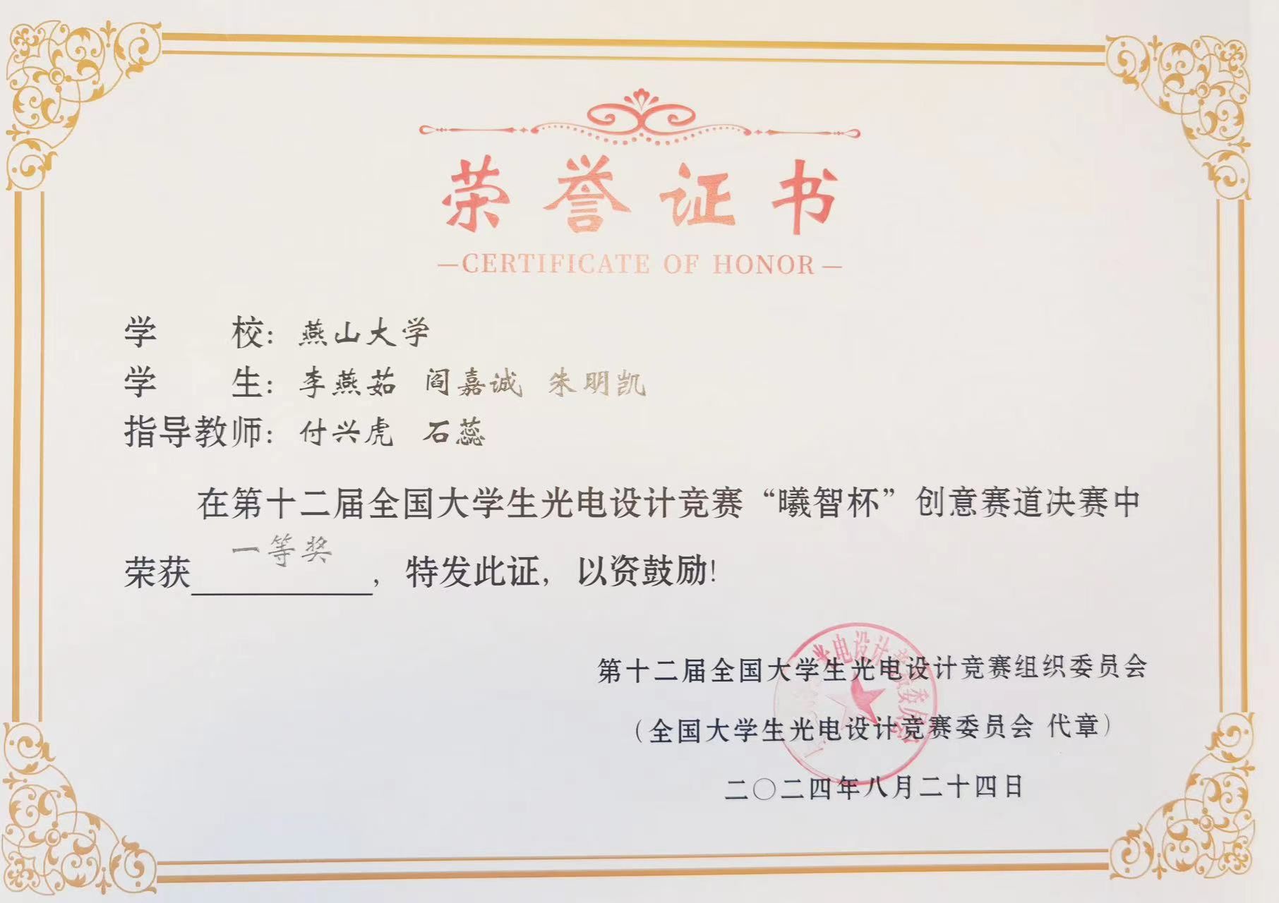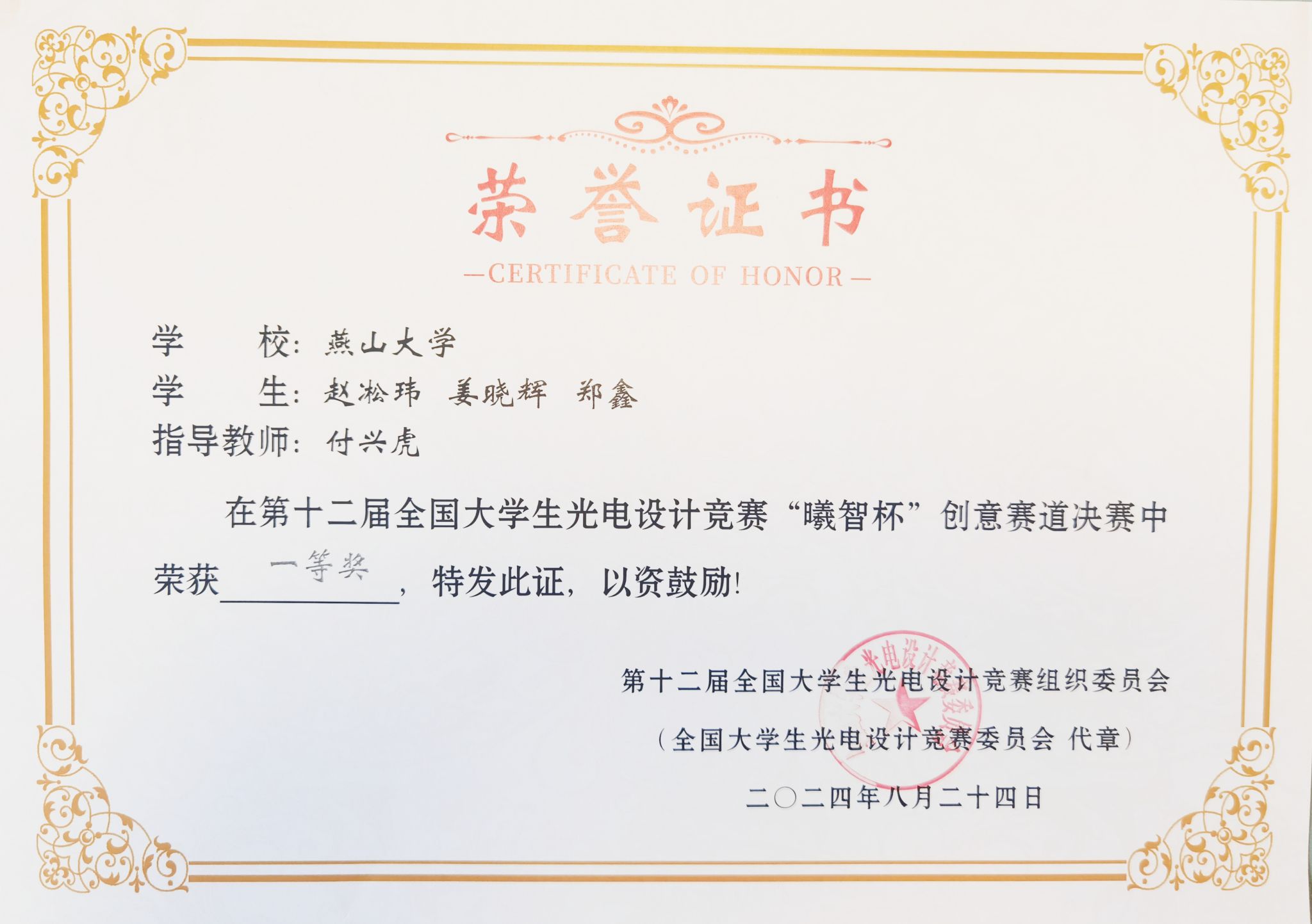 【新闻中心讯】近日,第十二届全国大学生光电设计竞赛“曦智杯”创意赛道决赛在西安电子科技大学举办。我校参赛团队奋力拼搏,再创佳绩,获得全国一等奖2项,三等奖2项。我校获得的一等奖数量位居华北地区高校首位,连续7年荣获国赛优秀组织奖!付兴虎、石蕊两位老师获得优秀指导教师奖。