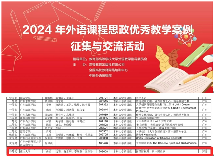 【新闻中心讯】近日,2024年外语课程思政优秀教学案例征集与交流活动省级评选工作落下帷幕。外国语学院曲炎老师团队的作品——《拓国际视野,讲中国故事》荣获河北省特等奖。