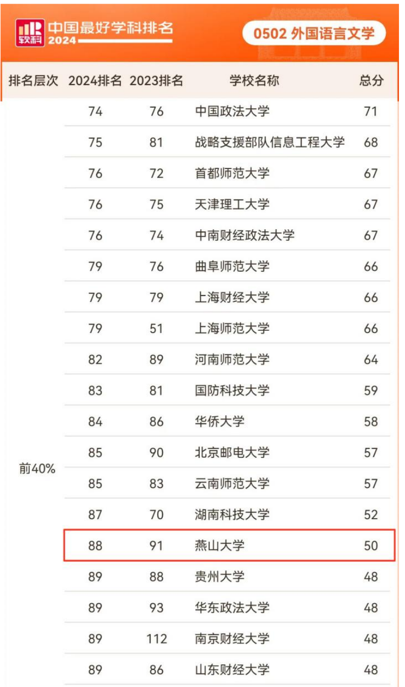 【新闻中心讯】10月15日,高等教育评价专业机构软科正式发布“2024软科中国最好学科排名”。外国语言文学学科共120个高校上榜,乌鸦传媒外国语言文学学科连续3年跻身“软科排名”全国前40%,与2023年相比,前进3名,位列88,居河北省第一位,外国语言文学学科建设取得新突破。