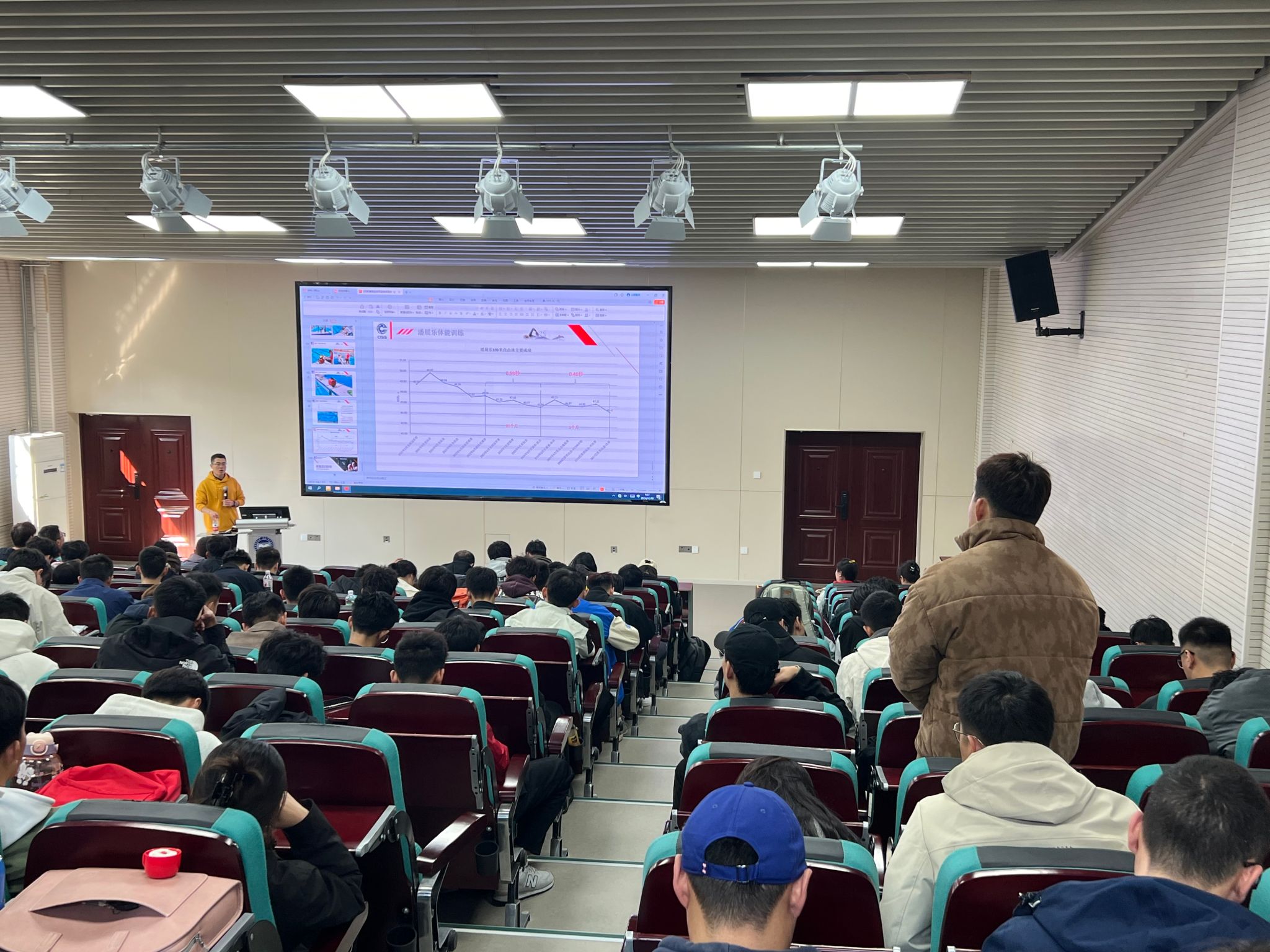 在案例分享环节,王博士详细介绍了他在执教国家曲棍球队和国家游泳队期间的体能训练经验,特别是2024年巴黎奥运会男子100米自由泳冠军,奥运会世界纪录保持者潘展乐的体能训练案例。他提出,应基于冠军模型为不同训练对象拟合个性化的训练路径,而非简单复制,突出了个性化训练的关键作用。这不仅让同学们对高水平运动员的专业体能训练工作有了更加深入地认识,也为各位老师提供了宝贵的教学思路。在问答环节中,学生们纷纷提出了自己在体能训练方面的疑问,王明波博士从专业的角度耐心地逐一进行了解答。