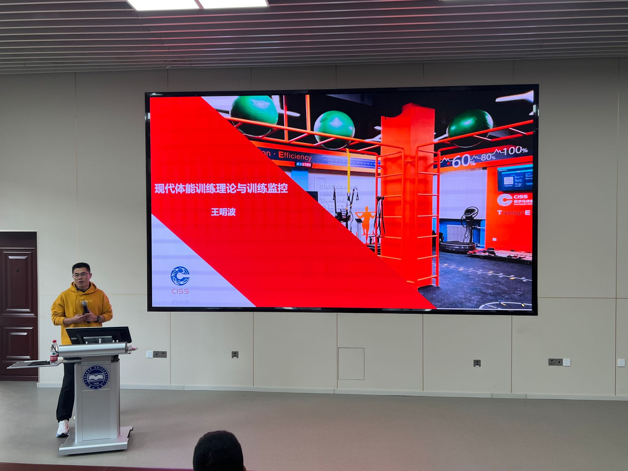 讲座以《现代体能训练理论与训练监控》为主题,在讲座中王明波博士首先阐述了体能训练的金字塔模型,强调了青少年时期身体功能训练和基础体能训练的重要性。王博士还强调了训练评估的重要性,介绍了多种科学化训练手段和仪器设备,如加速度传感器、GPS可穿戴设备、心率变异性监控系统、肌张力测量评估等设备,以实时监控运动员的内外负荷,确保训练的科学性和有效性。这深刻诠释了“没有数据就没有计划,没有测试就没有训练”这一训练理念,让同学们对于当前一些先进的训练手段有了进一步了解。