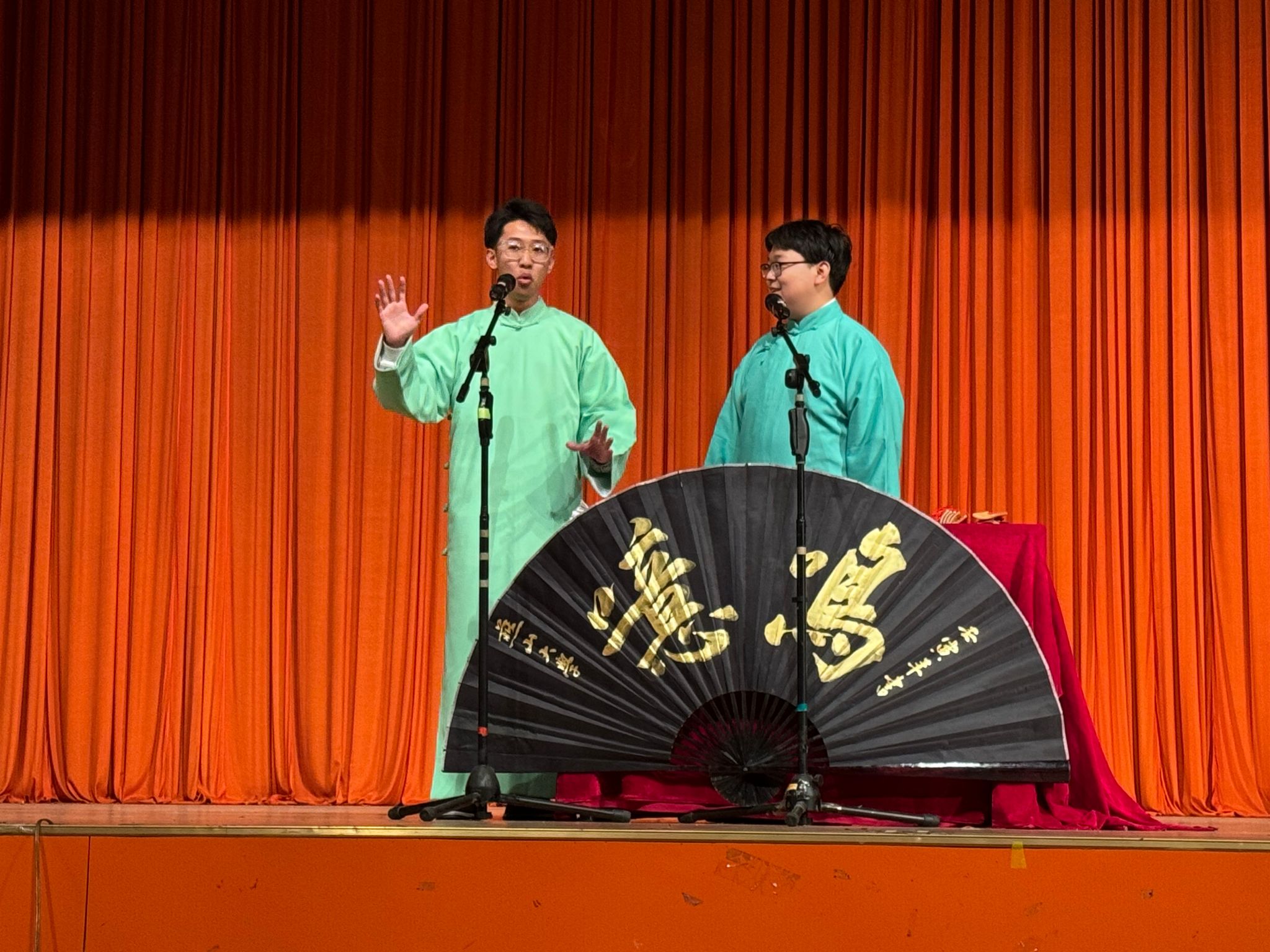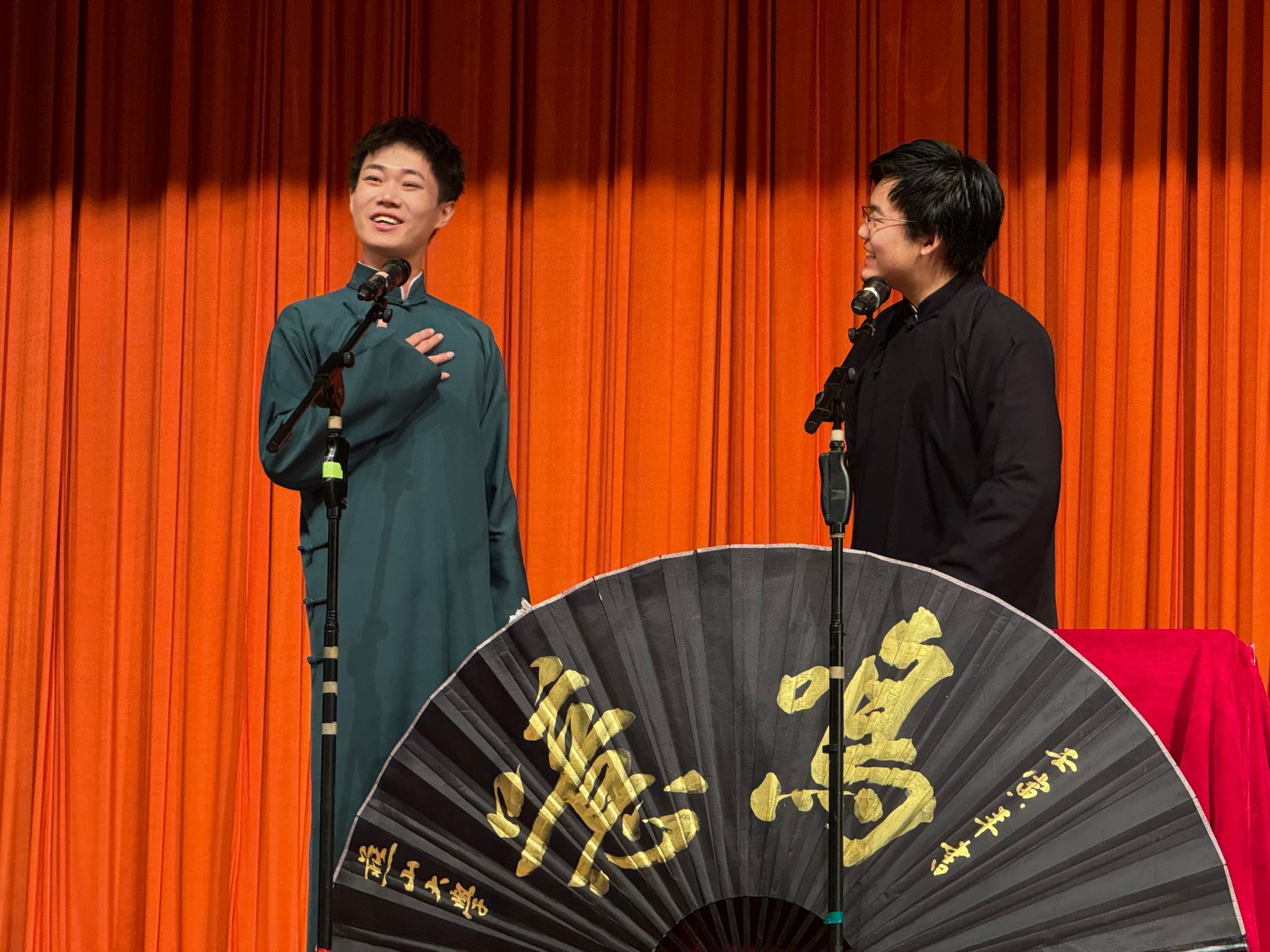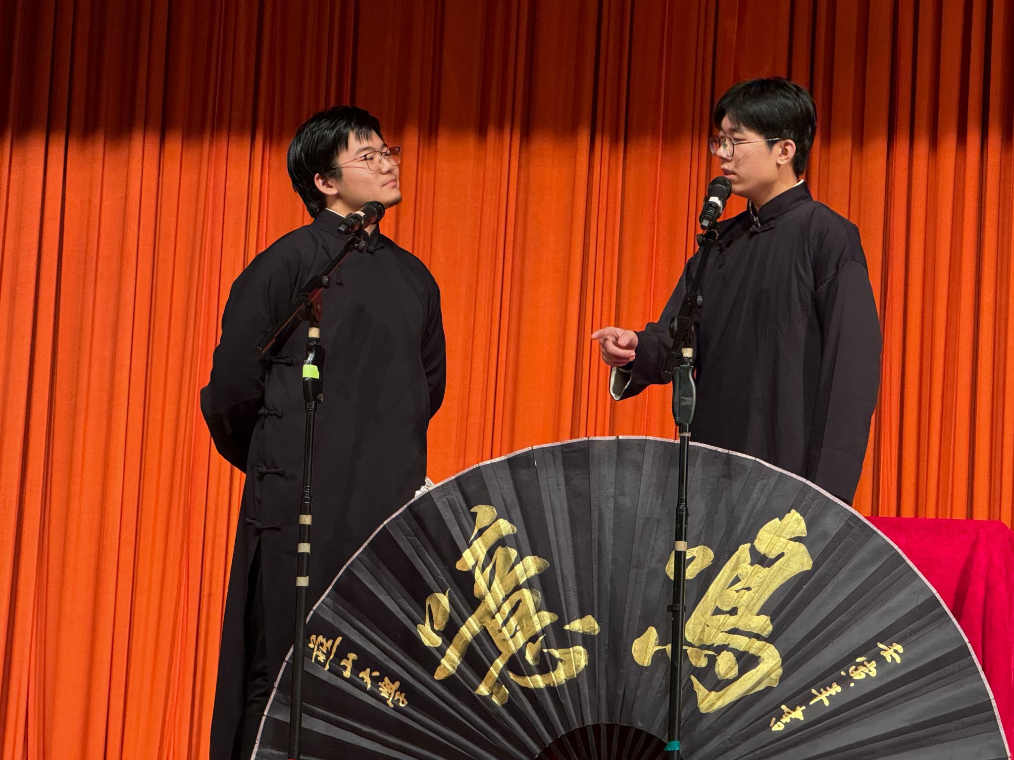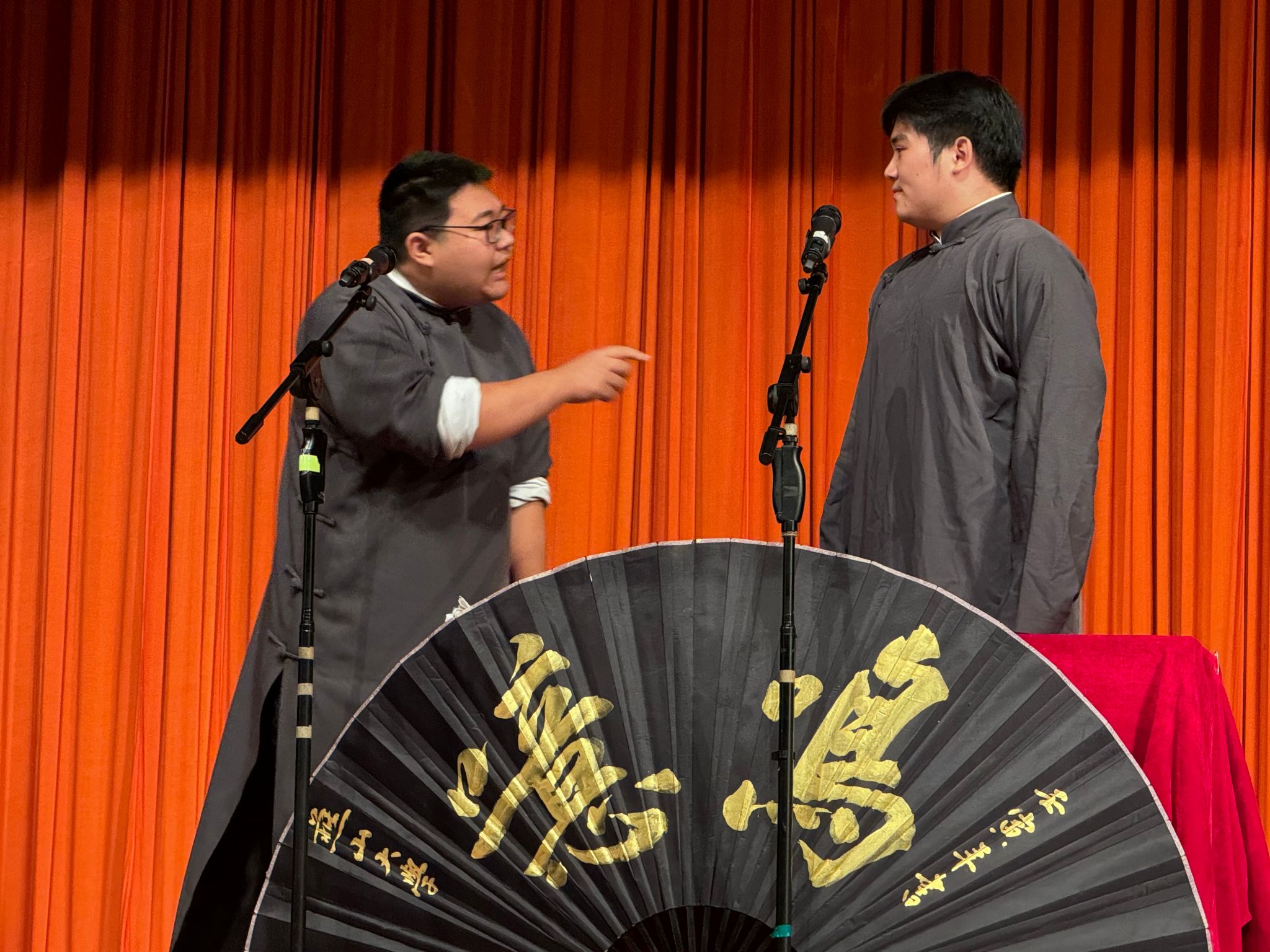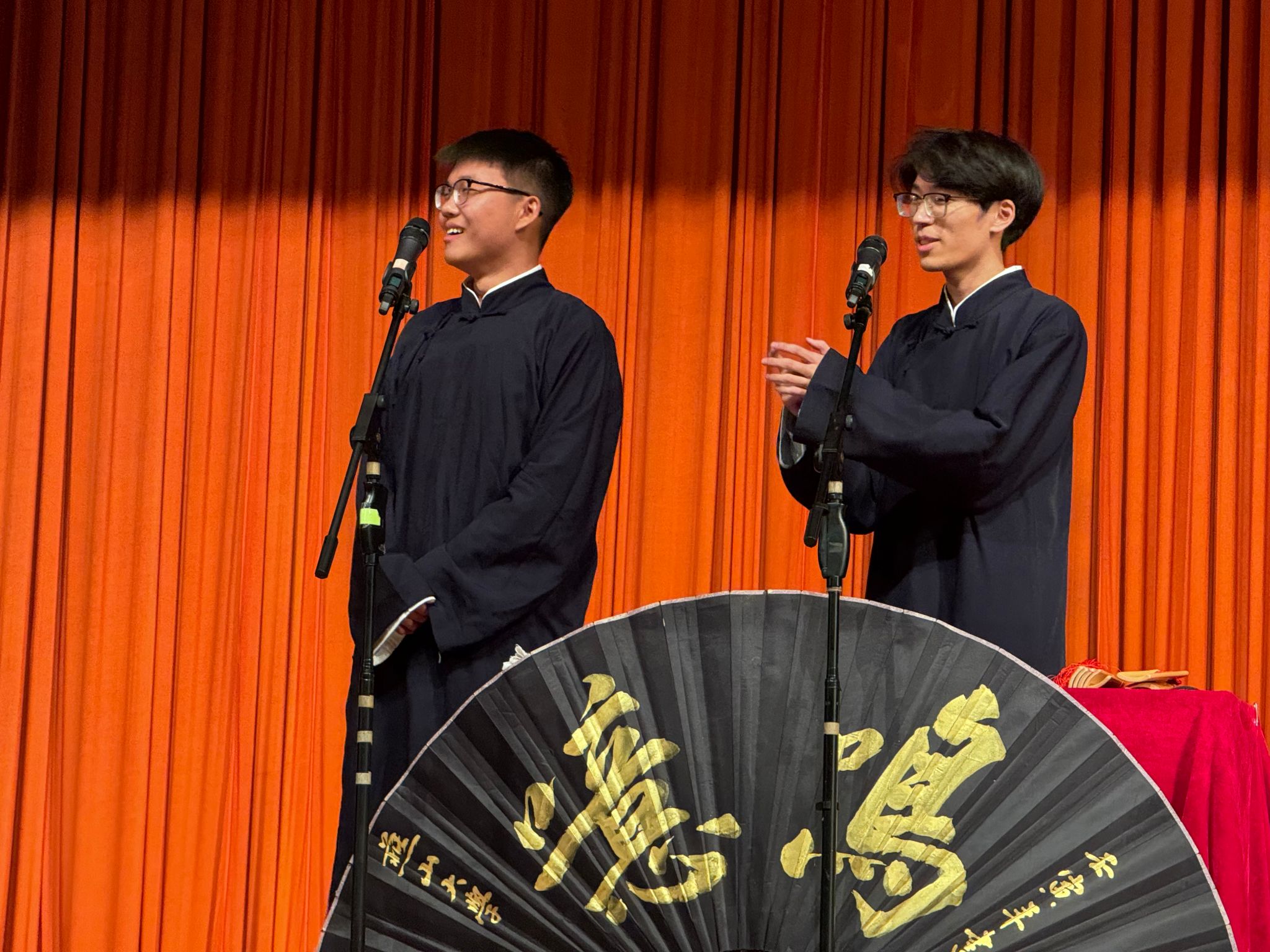 丁楷罡校友(左)和闫鹏(右)表演相声《黄鹤楼》