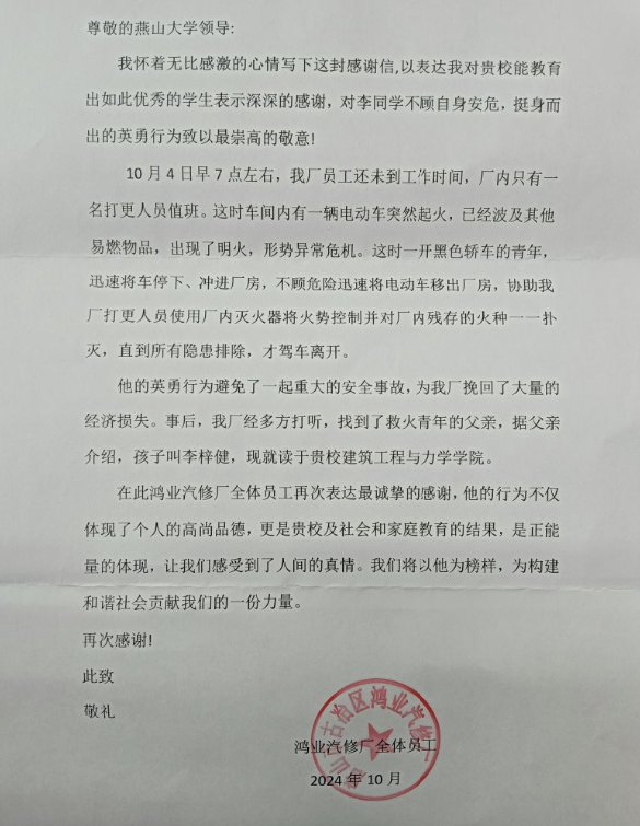 【新闻中心讯】10月31日,建筑工程与力学学院迎来了一批特殊的客人,他们手持“见义勇为施能手 弘扬社会正能量”的锦旗和感谢信,来寻找那个危急关头扑灭火情、避免唐山鸿业汽修厂遭受巨大财产损失的见义勇为好青年——学院2022级土木工程专业学位硕士研究生学生李梓健。一面锦旗、一封感谢信,道出了一个暖心的故事。