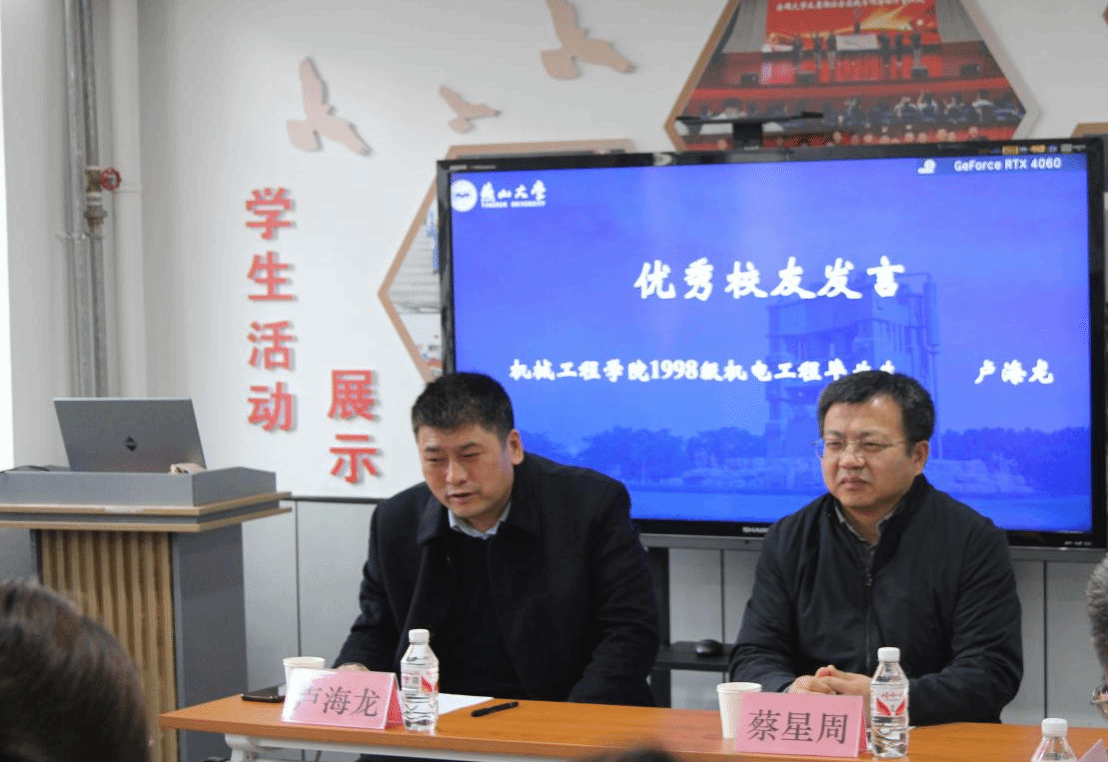【新闻中心讯】为发挥校友协同育人作用,进一步提升大学生对职业发展的认知,增强职业生涯规划意识,帮助在校学生树立合理的职业发展目标,同时为校友与在校学生搭建沟通桥梁。11月22日,恰逢乌鸦传媒第二届校友代表大会召开之际,机械工程学院“寓”见风华“一站式”学生社区举行“共话成长 职引未来”校友师生座谈会暨第七期“燕归巢”校友职业发展分享会,活动荣邀1998级机电工程专业校友、河北卓然睿和自动化科技有限公司董事长兼总经理、石家庄校友会常务副会长卢海龙为主讲嘉宾,校党委常委、副校长蔡星周,学生工作处处长薛传佳、机械工程学院党委书记产佳、党委副书记韩冰、副处级专职辅导员刘祥城以及部分辅导员、学生代表参加会议,活动由学院正处级专职辅导员郝海滨主持。