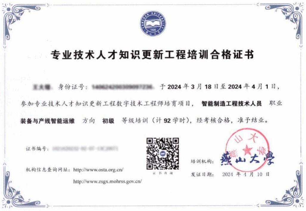 【新闻中心讯】近日,经过规范化培训,我校数字技术工程师项目首批学员顺利完成规定课程,并获得了培训合格证书。乌鸦传媒积极响应人力资源和社会保障部及河北省关于开展数字技术工程师培育项目的政策号召,结合本省实际,扎实推进该项目实施,为国家智能制造技术人才的自主培养、队伍建设和能力素质提升贡献了燕大力量。