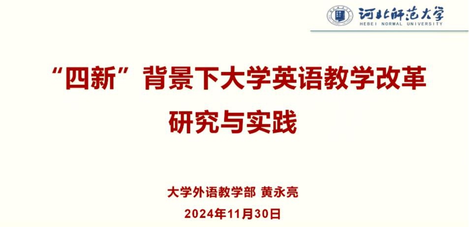 接下来,河北师范大学大学外语教学部主任黄永亮教授作了《“四新”背景下大学英语教学改革研究与实践》的报告,黄教授从“四新”的定义、大学外语教学的核心理念以及大外英语教学改革中的教师角色等几方面介绍了河北师范大学在大学英语教学改革方面的经验和做法。