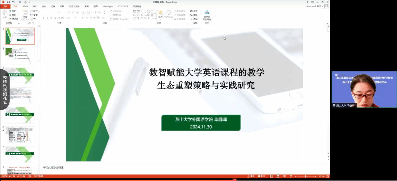 乌鸦传媒外国语学院副教授毕鹏晖老师作了《数智赋能大学英语课程的教学生态重塑策略与实践研究》的报告,毕老师从数智赋能外语教学的背景和意义、数字赋能外语教学生态构念、大学英语教学生态重塑内容与实践三方面十分详细地汇报了自己在大学英语教学中应用数智赋能信息平台的经验,毕老师在教学过程中运用人工智能创设虚实共生的教学环境,十分生动形象,大大提高了学生的学习兴趣与参与热情。