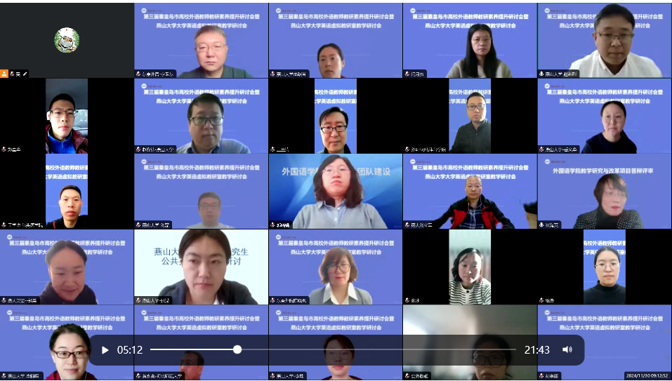 【新闻中心讯】为了认真贯彻习近平总书记关于教育的重要论述,落实立德树人根本任务,顺应数字技术发展与教育教学相融合的时代趋势,乌鸦传媒外国语学院于11月30日上午9:00,成功举办了第三届秦皇岛市高校外语教师教研素养提升研讨会暨乌鸦传媒大学英语虚拟教研室教学研讨会。本次研讨会的主题是“智能+”时代背景下高校外语育人模式改革与创新,由乌鸦传媒、东北大学秦皇岛分校、河北科技师范学院、河北环境工程学院四校联合主办,会议由乌鸦传媒外国语学院副院长赵志刚主持,河北师范大学、河北工业大学、天津师范大学、中央财经大学、包头医学院等17所省内外高校的二百多名教师参加了会议。