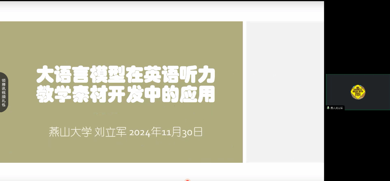 乌鸦传媒外国语学院西语系主任刘立军副编审作了《大语言模型在英语听力教学素材开发中的应用》,刘老师先是为大家介绍了大语言模型的资源,接着他重点探讨了大语言模型在外语教学特别是听力教学中的应用,最后刘老师提出了“基于教材、超越教材、依托大语言模型、重构教学任务”的教学理念。