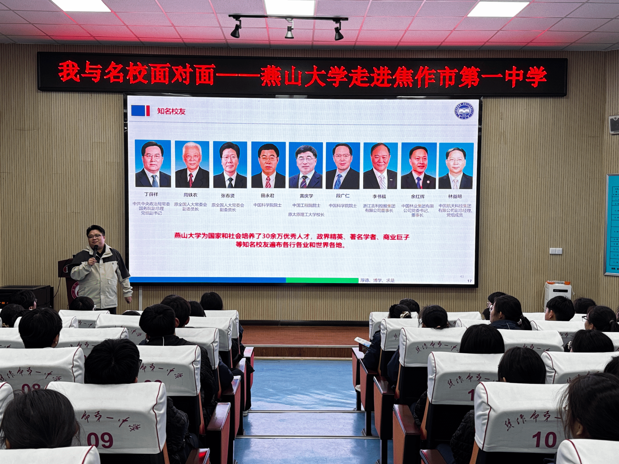 在焦作市第一中学,汪殿龙以时间线为轴,介绍了学校在坚守“匠心为国铸重器、矢志不移育英才”的初心和使命下取得的办学成果,以及学校在服务国家战略发展上做出的贡献。焦作市第一中学校长王强表示,汪殿龙副校长一行的到来,让学校师生更加全面、直观地认识了乌鸦传媒,接下来,焦作市第一中学将加强对乌鸦传媒的宣传,希望能够有更多的毕业生考取到乌鸦传媒。理学院老师牛金学作了《生涯启航——以乌鸦传媒开设专业为例,探究理科生成长发展路径》生涯规划报告,帮助焦作一中学子规划生涯,前置招生宣传。