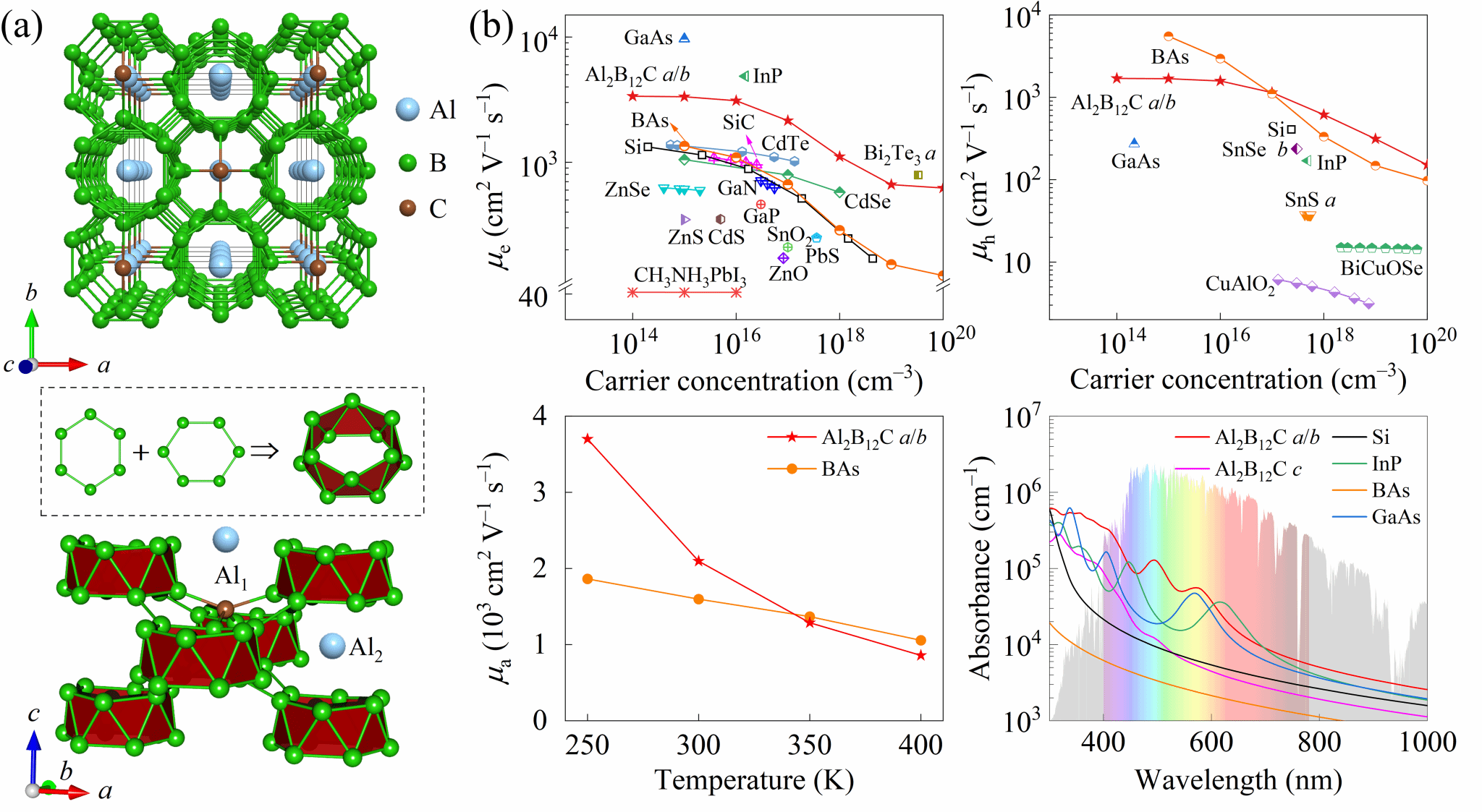 图为Al2B12C的(a)晶体结构,(b)双极性载流子迁移率和光吸收谱