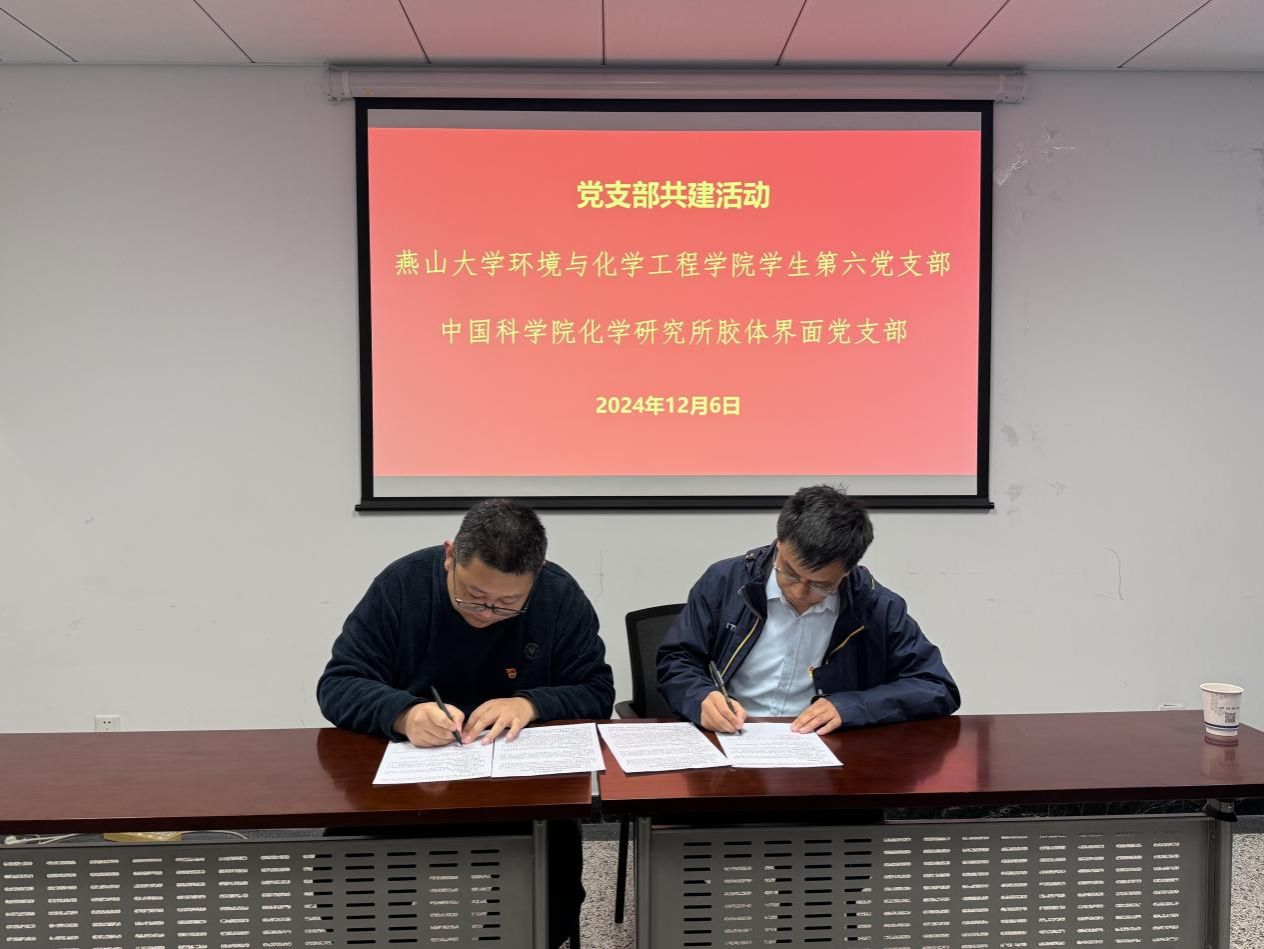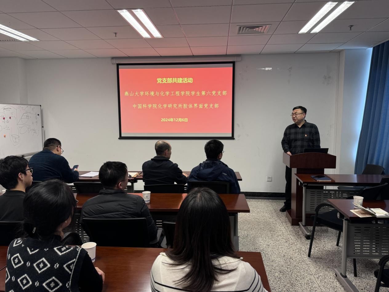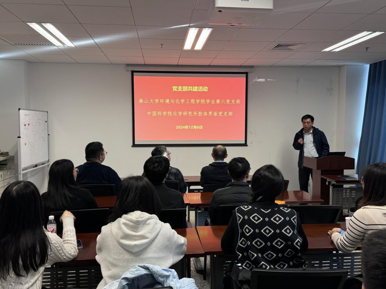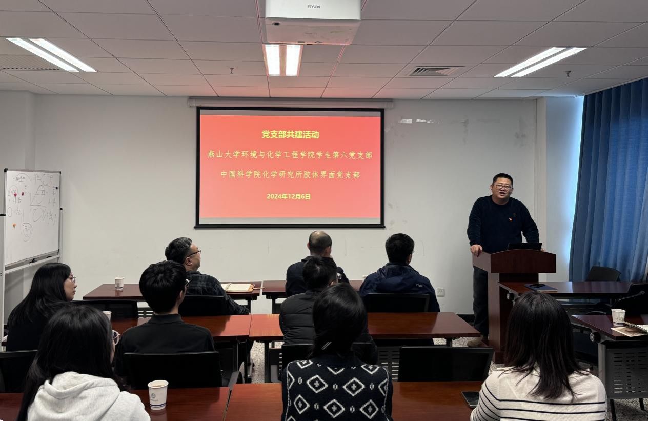 【新闻中心讯】为进一步强化党建与业务“双融双促”,推动学院教学科研高质量发展,近日,环境与化学工程学院党委书记严冰带队前往中国科学院化学研究所开展党支部共建学习,交流党建特色做法与办学经验,学院副院长、学生第六党支部书记焦体峰及双方支部党员代表参加交流会。