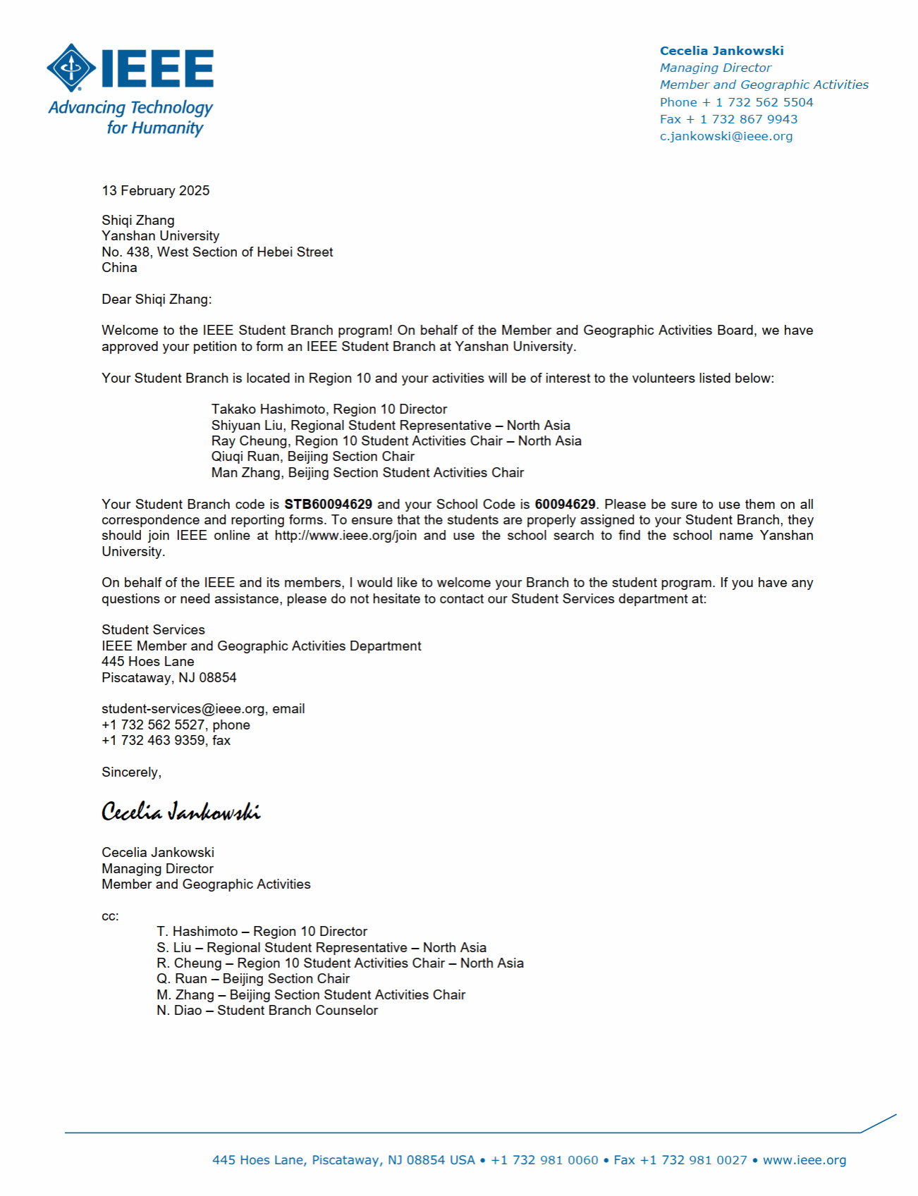 【新闻中心讯】近日,经过国际电气与电子工程师协会(The Institute of Electrical and Electronics Engineers, IEEE)总部批准,IEEE乌鸦传媒学生分会(IEEE Yanshan University Student Branch)获批成立。该学生分会是在乌鸦传媒电气工程学院郭小强院长的指导下,由乌鸦传媒博硕士研究生共同发起,电气工程学院博士研究生章仕起担任首届学生分会主席。