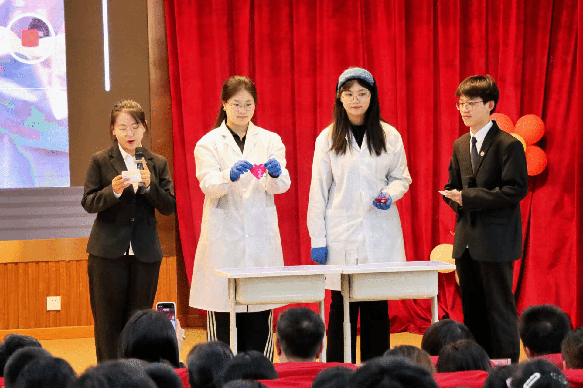 活动中,志愿者们带来了三个精彩纷呈的化学小实验。第一个实验“信仰之色——酚酞遇碱‘魔法显红’”让小朋友们亲眼见证了酚酞溶液遇到碱性物质时变红的神奇变化,深刻理解了酸碱指示剂的作用原理。第二个实验“奋进之光——硼酸乙醇的‘星火燎原’”,通过不同粉末点燃会产生不同颜色的火焰,革命火种如微量硼元素,在黑暗中艰难孕育,最终绽放出耀眼光芒,激发了孩子们对化学世界的好奇心和探索欲。最后一个实验“创新之志——醋酸钠结晶‘冰火交响曲’”通过醋酸钠溶液的冷却结晶过程,制作出醋酸钠晶体,引发孩子们对“冰火相融”的惊叹,借此鼓励少年儿童永葆创新热情。
