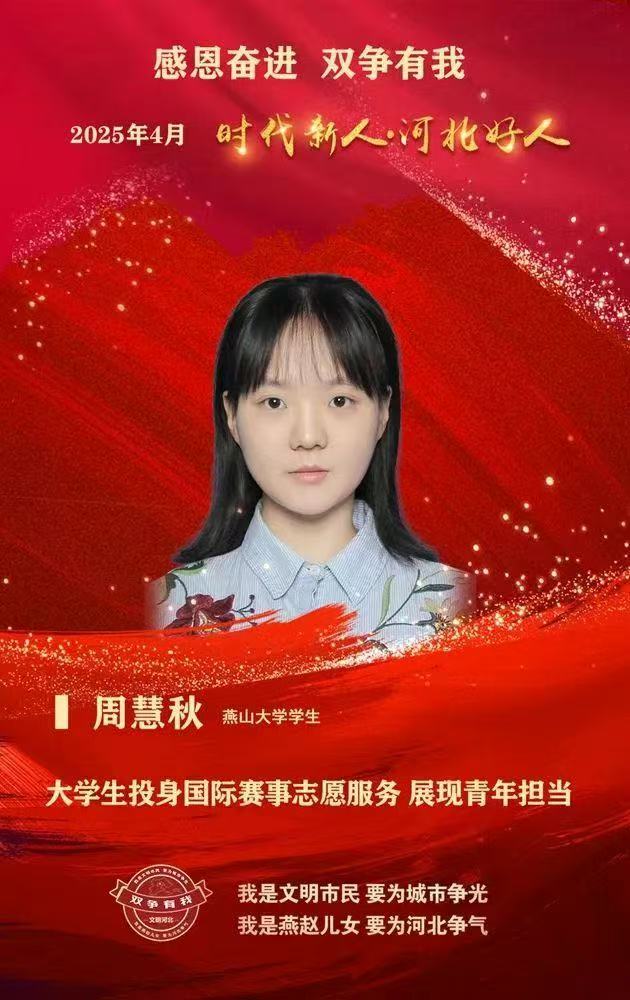 【新闻中心讯】“我是文明市民、要为城市争光,我是燕赵儿女、要为河北争气。”5月10日,感恩奋进 双争有我——2025年4月“时代新人·河北好人”发布暨道德模范与身边好人现场交流活动在邢台隆尧县举行。我校外国语学院2021级本科生周慧秋荣获"河北好人"称号,本期榜单中全省仅两名高校学生获此殊荣。