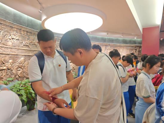 随后踏入东北亚古丝路文明博物馆,志愿者为学生们系上不同颜色的丝带,丝带如同连接古今文明的线索,带领师生们共同解密博物馆里的“文化密码”。