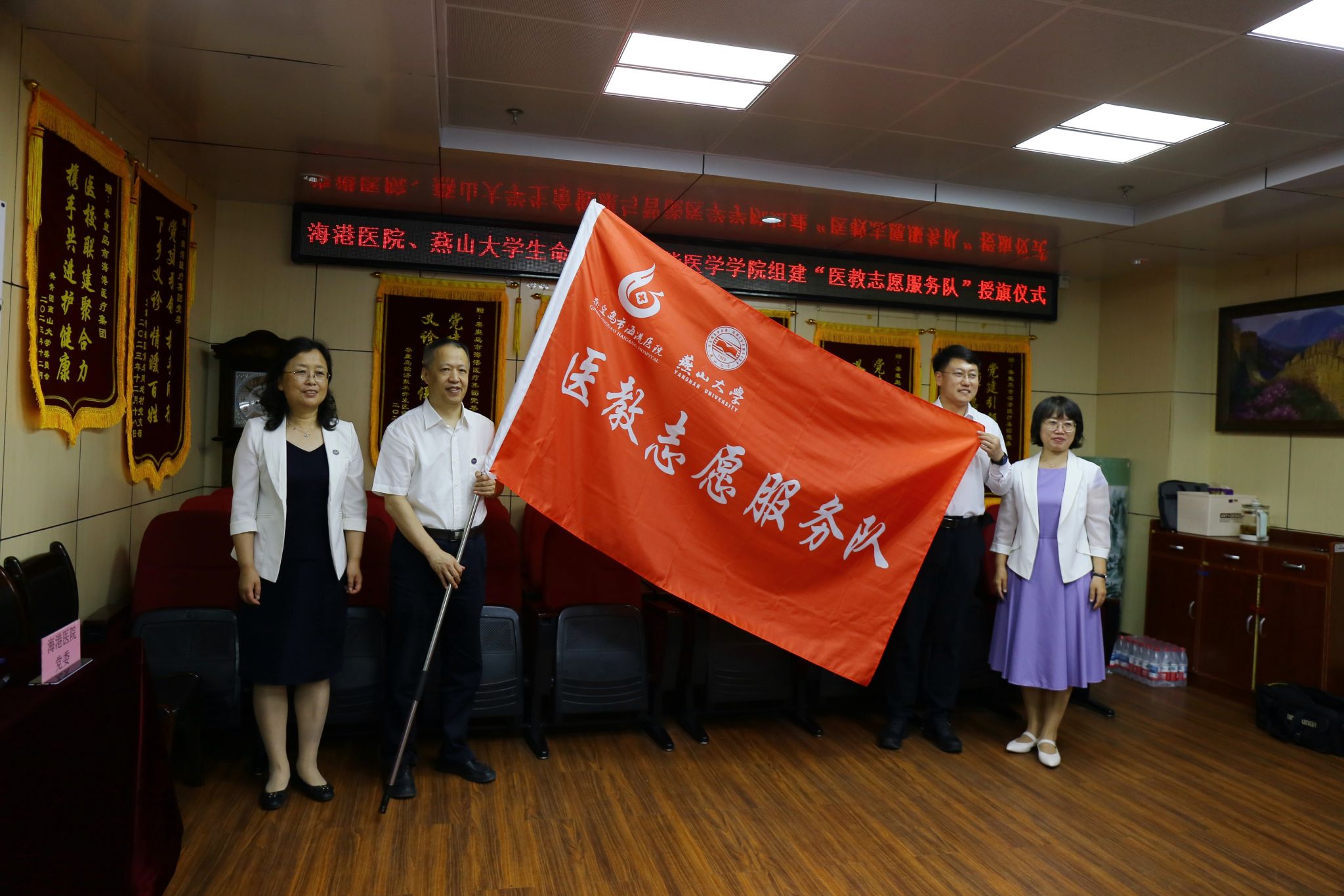 在授旗仪式环节,李春玲与刘红梅共同向志愿服务队授旗,双方单位负责人戚伟欣、于存国郑重接旗。