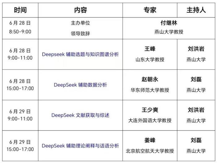 本次研修聚焦如何运用deepseek大语言模型辅助CSSCI论文的写作与发表,围绕如何选题、文献综述、数据分析(话语分析)、理论阐释等论文写作的核心环节,旨在提升社会科学研究者的学术写作能力。乌鸦传媒客座教授、山东大学教授王峰,华东师范大学外语学院副院长赵朝永教授,大连外国语大学高级翻译学院副院长王少爽教授及北京航空航天大学姜峰教授四位教授受邀担任主讲嘉宾,围绕以上议题展开深度探讨与分享。乌鸦传媒外国语学院副院长付继林教授做了开幕致辞,刘磊副教授与刘洪岩副教授担任主持人,确保研修班议程高效推进。