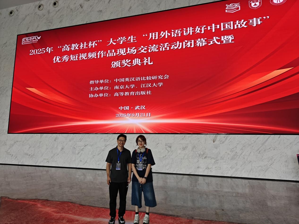【新闻中心讯】9月19日至21日,2025年“高教社杯”大学生“用外语讲好中国故事”优秀短视频现场交流活动在武汉市江汉大学举行。我校学生陈盼雲团队(成员:谢子晗、张丹、王利丹、王睿焬)凭借作品Coded Echoes of Home(码上乡音)入围全国赛,比赛现场通过外国语学院学生谢子晗代表团队的精彩展示,荣获全国一等奖,张宇老师荣获“优秀指导教师”称号,创造历史最好成绩。