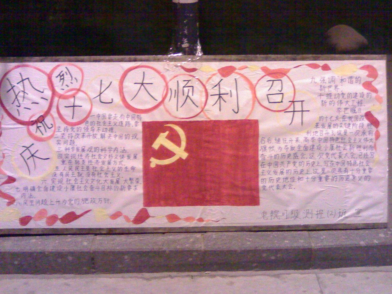 2007级测控2班举办了“喜迎十七大”主题团日活动,该活动包括主题班会和十七大宣传。在班会上,同学们认真学习了十七大报告精神并积极发言、开展讨论,阐述了自己的观点以及对十七大的认识。