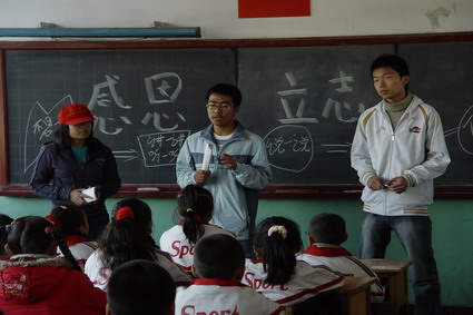 【新闻中心讯】为了加深小学生对父母的理解,感受父母的辛劳,使孩子们能在生活中用实际行动回报父母,同时也让大学生得到能力的锻炼和素质的提高,环化学院“绿色先锋”青年志愿者协会于11月1日开展了以“爱心助成长,感恩父母,立志成才”为主题的志愿者活动。 10月28日晚,绿色先锋在第一教学楼进行了志愿者招募工作,并于31日晚在原材料馆210会议室举行了启动仪式。会上,院团委书记张志超以及青年志愿者协会、绿色先锋负责人分别进行了讲话。 11月1日上午,部分志愿者在燕大校园里进行了“深化感恩情”的宣传。第一组志愿者在燕鸣湖畔向过往的同学分发了“感恩卡片”,并让他们在卡片上写下对父母的感激之情。之后,志愿者将这些卡片整理后粘贴在感恩心语板上,并在三舍楼下进行了展出。 志愿者第二小组在餐厅门口针对大学生与父母的沟通与了解情况进行了问卷调查。而第三小组则在教室课桌等适当位置统一粘贴了感恩标语。 下午2:00在光明路小学,环化学院与光明路小学联谊完成了以志愿者与该校小学生为主体的“深化感恩情”活动。光明路小学校长朱秀梅,党支部书记杨浃宏,副校长张若愚,王义选,德育部主任党蕾,环化学院党委副书记、副院长任海,环化学院团委书记张志超、“绿色先锋”主席唐继昕出席了在光明路小学操场举行的启动仪式。会上环化学院任海副书记和光明路小学朱秀梅校长分别进行了讲话。在志愿者和光明路小学的学生合作进行了诗歌朗诵之后,志愿者又为光明路小学的师生带来了手语表演“感恩的心”。会后,志愿者对小学生进行了课堂感恩教育。每班三名志愿者以真实的感恩事迹、游戏、图片展示以及歌曲演唱等形式为小学生们送上了一堂生动活泼的感恩教育课。志愿者还给同学们发放了小卡片,让他们写下了对父母的祝福,同时以作业的形式让同学们把自己的卡片交给父母,并为父母做一件力所能及的事。 在光明路小学图书馆,部分志愿者在管理员的指导下科学合理地进行了图书目录的录入工作。 据悉,此次活动的后续活动仍在继续进行。绿色先锋将陆续派出志愿者继续为光明路小学进行两万册图书数据的录入,还将在青云里小学开展与小学生“一对一”、“手拉手”的活动,为他们送去爱心和温暖。(编辑 朱可嘉)