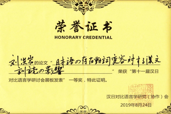 此次研讨会由学术沙龙、分科会、博士论坛和报告会等构成,共计百余名国内外专家学者在会上交流日语语言学相关的学术热点问题。外国语学院教师刘洪岩的论文因在方法论和结论上极具创新性,故荣获“第十一届汉日对比语言学研讨会展板论文”一等奖。这一奖项对刘洪岩老师的教学及研究成果给予了高度肯定。(编辑 褚玉晶)