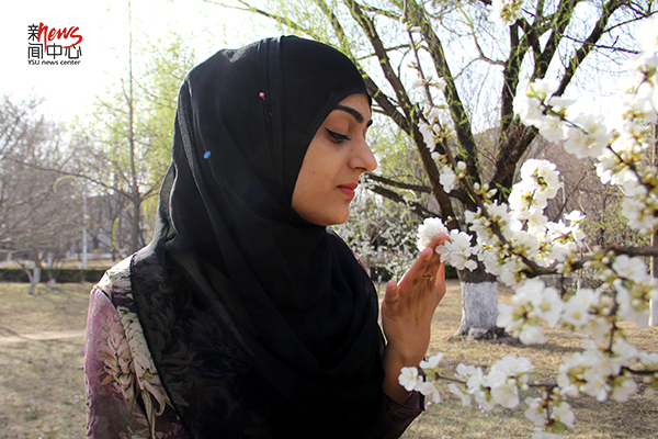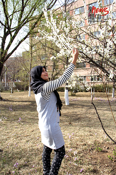 花开了,马佳站在树下,嗅一嗅花朵的芬芳。(毕佳畅)