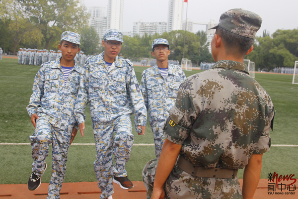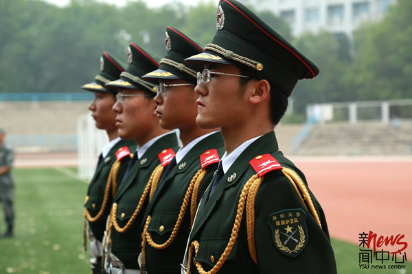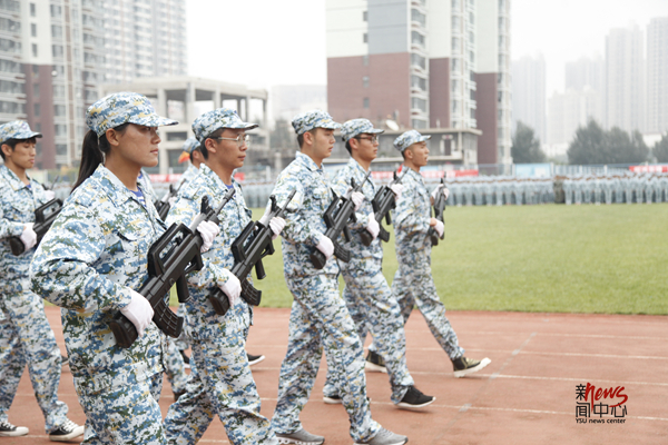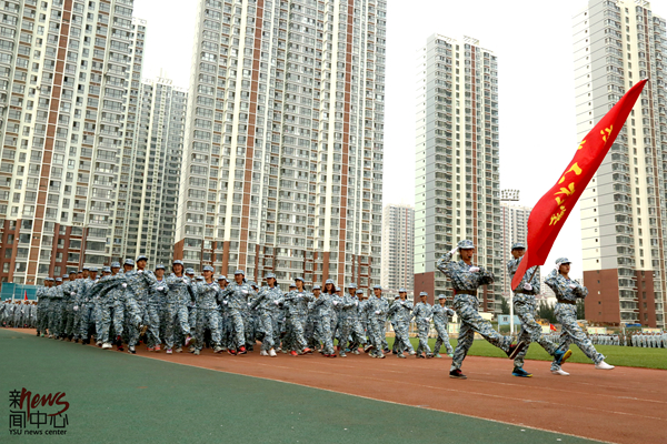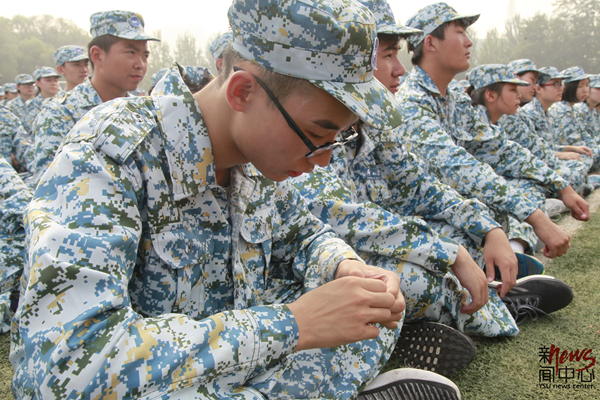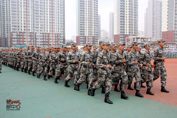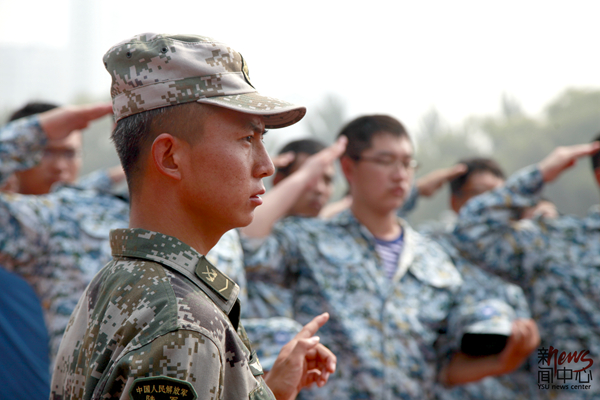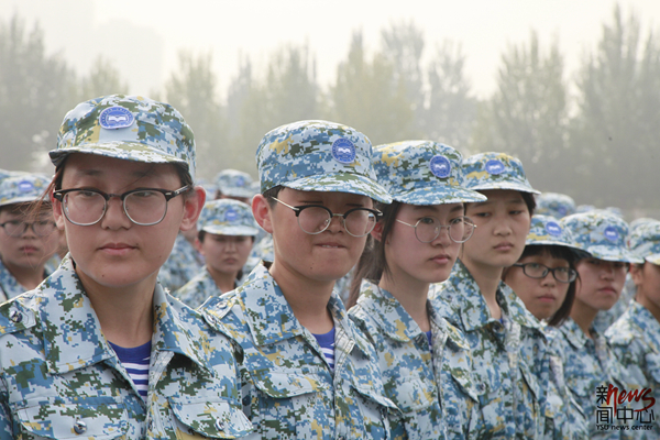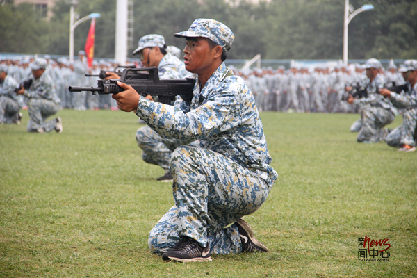 全体新生用十天的努力训练,在军训总结大会上一展英姿(李晖)