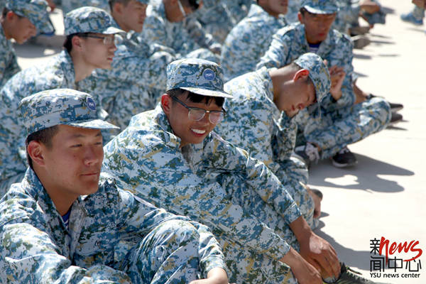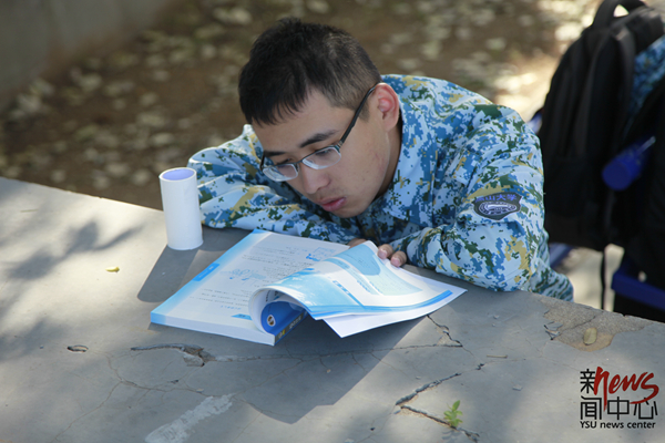 身体不舒服,不能军训。但我仍在操场上,提前预习一下大学课程也好。(胡晨凯)