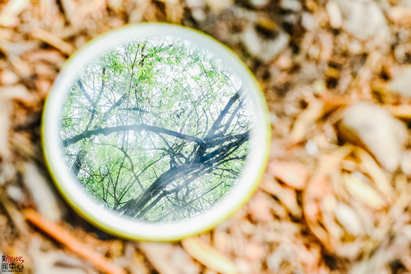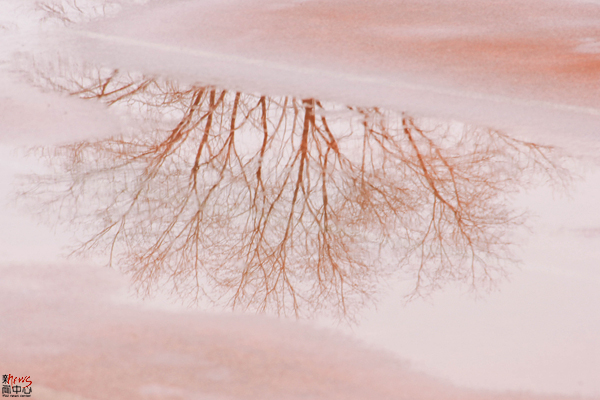 操场的小水洼映出树枝斑驳,镜像之美无处不在(田润)