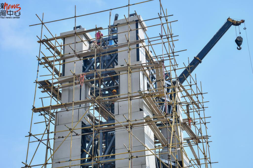 在校庆筹备期间,校园里随处抬头即可见高空作业工人。