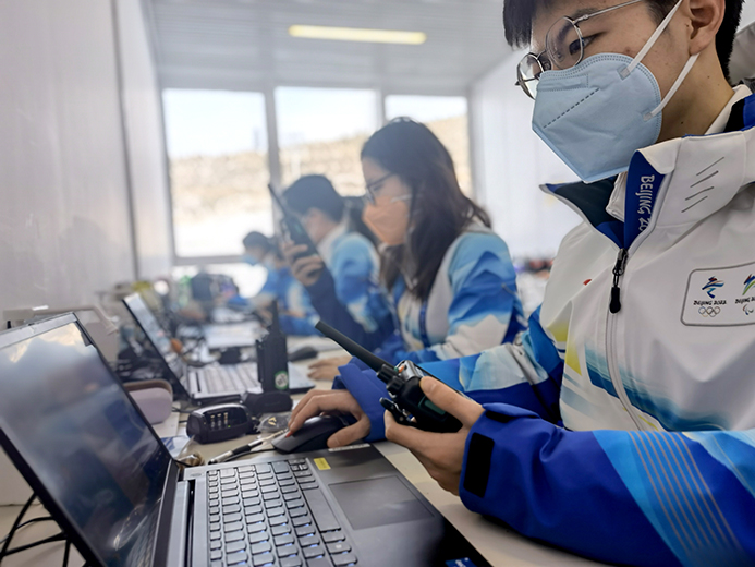 国家冬季两项中心赛事服务领域的志愿者正在进行通信管控,