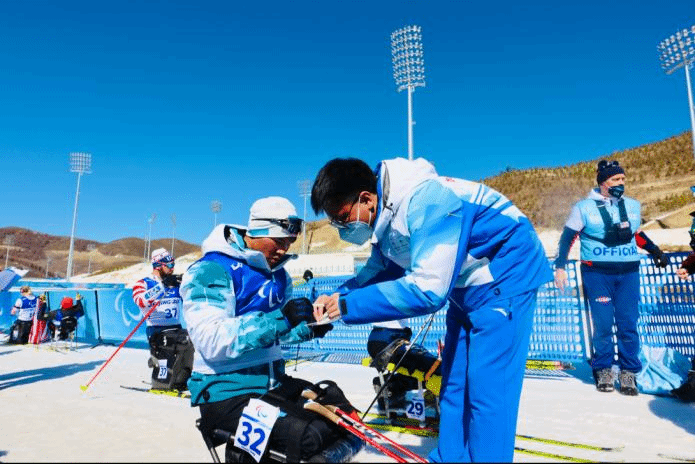 帮助残奥男子冬季两项男子10公里坐姿组冠军刘梦涛整理仪表。