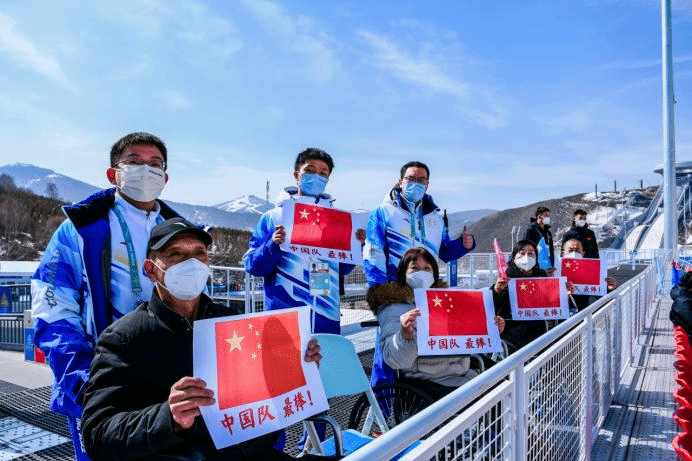 志愿者带动行动不便的观众为中国运动员加油助威,五星红旗熠熠生辉。