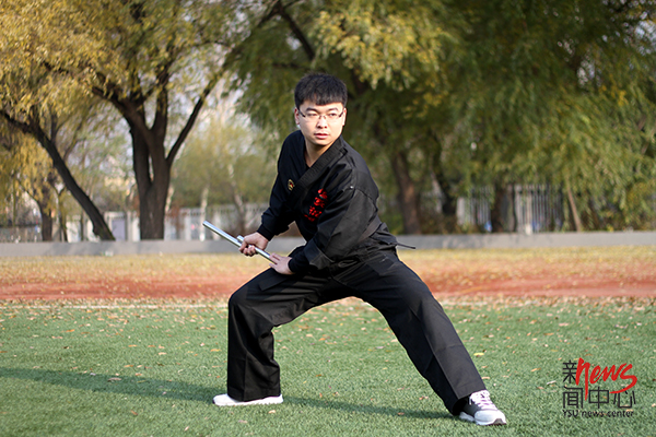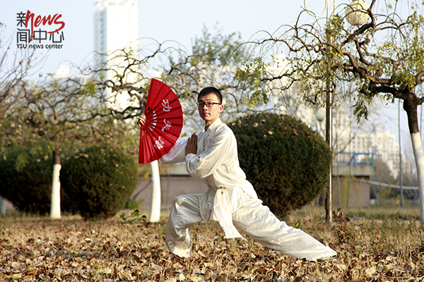 运动之星董超奇:弓步出扇尽潇洒,习文练武好儿郎。(解丽萍/摄)