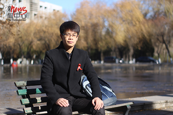志愿之星梅飞雄:红丝带系于胸前,将爱撒满燕大。(杨峻岭/摄)