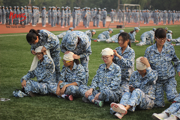 模拟战地救护,看我包扎的还好吧。(解丽萍 摄)