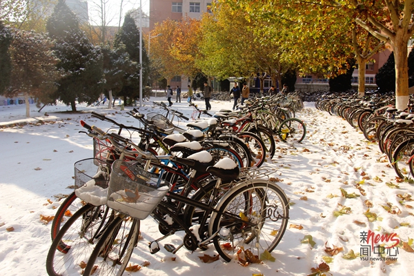 落在宿舍门前的自行车上(周煜/摄)