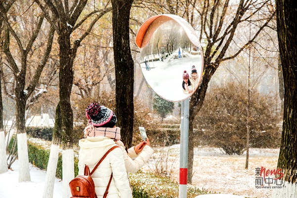 路边的小伙伴记录下期盼已久的雪(王三众/摄)