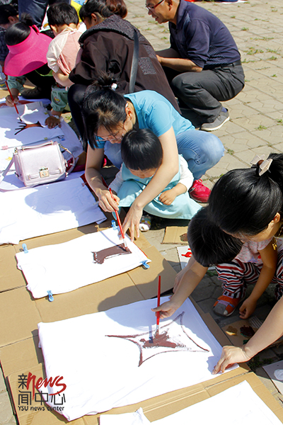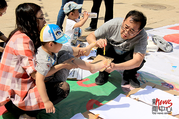 涂上颜料踩脚印(王雪 摄)