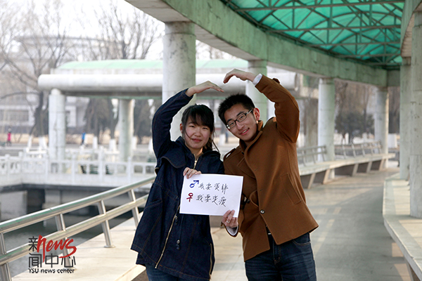 信息学院李阳、建工学院解丽萍,师傅:“徒弟好好学习。”徒弟:“师傅天天向上。”(付心怡/摄)