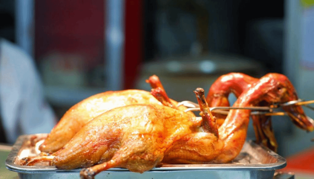 整只烤鸭金黄的色泽和诱人的香气令人垂涎欲滴